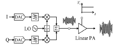 像WCDMA这种会用到振幅调变的信号,只能用线性PA作放大,亦即在升频过程中,是采用所谓的I/Q Modulation,如下图: