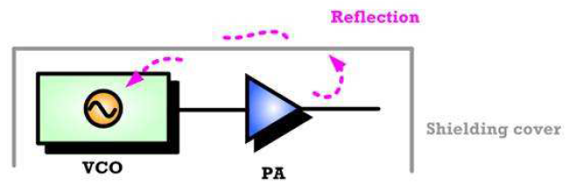 除了邻近走线外,其发射信号也可能会通过Shielding Cover,产生VCO Pulling,若 Shielding Cover与Shielding Frame接触不是很紧密,即接地不是很好,则耦合到 Shielding Cover上的发射信号,并不会通通流到 GND,而是会通过反射,窜入收发器,导致VCO Pulling。