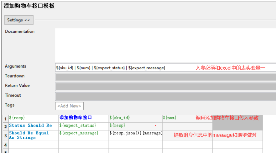 在[接口默认参数]目录中创建一个 评论.json文件,内容写所有参数的默认值,其中写xxxx代表这个是动态数据,必须每次都由调用方传递 关键字入参的含义: ${order_sn}、${sku_id}都是必传参数,${other}给了一个默认值,表示可以不传,如果用户需要针对json参数里除了order_sn和sku_id的参数进行测试时就要以${other}代表,${other}的传递规则是字符串形式的json格式字符串,key必须是jsonpath表 达式,value是要替换的新值例如: 针对替换json串中的特定字段封装一个自定义关键字 ,在业务关键字.robot下创建一个用户自定义关键字如下,业务关键字需要导入JSONLibrary 脚本解释: 第一行:读取 [接口默认参数] 目录下的评论.json文件,得到默认json参数 第二/三行:把用户传入的order_sn和sku_id更新到${comment_info}中去 第四行:判断${other}不等于default,说明用户传了其他数据,那么${other}转换成json第五行:判断${other不等于default},调用[替换json数据]关键字替换并且返回数据02
