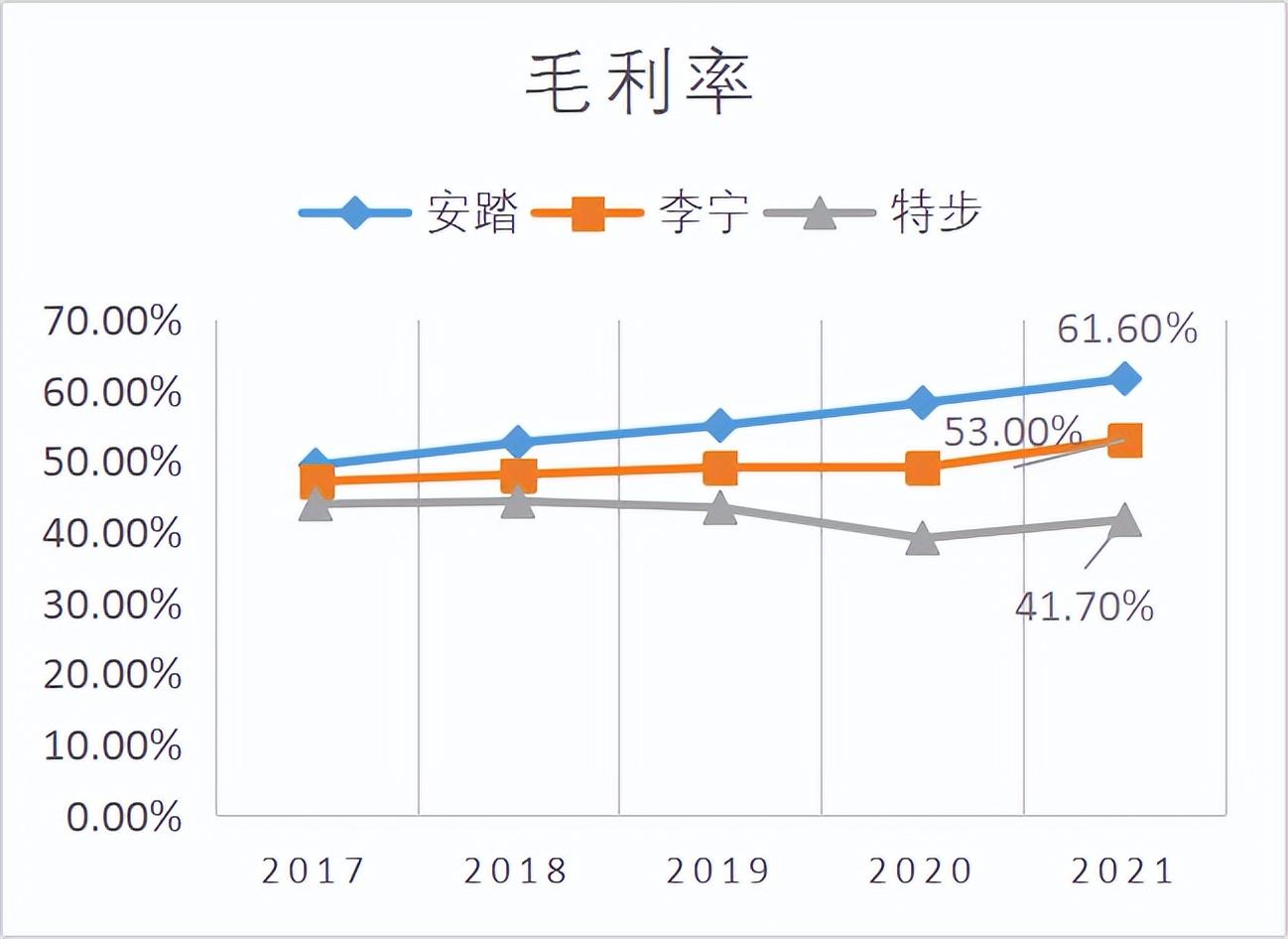 对比安踏李宁和特步三家企业财务数据,五年营收CAGR分别为31.11%、26.29%、18.3%。再看毛利率,2021年安踏李宁和特步分别为61.6%、53%和41.7%。 历史财务数据显示,特步和安踏李宁的差距越来越大。