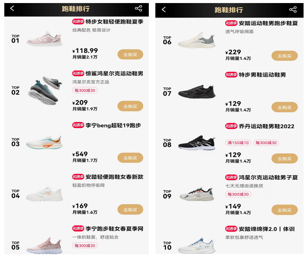 此外,特步跑鞋的占有率并没有绝对领先于同行,也有微观数据的支撑。从天猫数据中统计跑步鞋当月销量,发现虽然特步“动力巢”鞋名列第一,但是销量前十的款式只占了一种,而361度有两种,安踏更是高达三种。