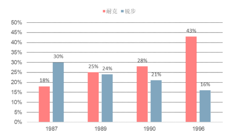 图:NIKE、锐步美国市场占有率历史,来源:中信建投研究院