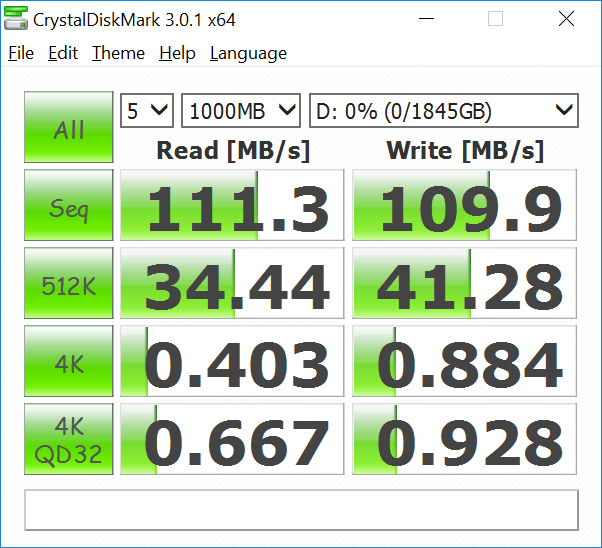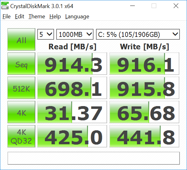 这部笔记本支持 NVMe SSD,不过我们这台配备的是两块1TB 闪迪 X400 SD8SN8U1T001122 SATA M.2 SSD RAID 0 磁盘阵列,速度稍微慢了一些,但价格更加适中,普通读取速度大约在900MB/s 以上,跟三星 SM951的1600MB/s 相比,要弱很多。