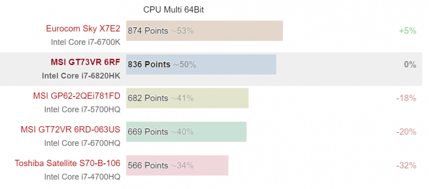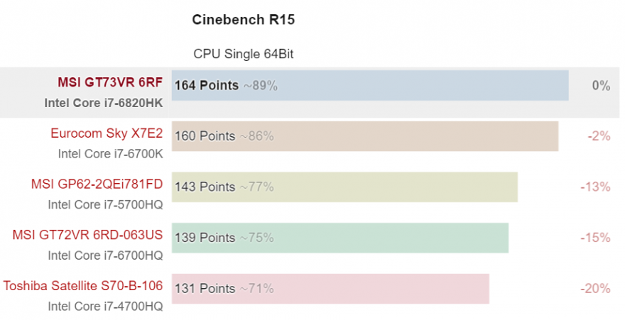 在 CineBench 的跑分中,GT73VR 上面这颗 i7-6820HK 跟 Broadwell i7-5700HQ 以及 Haswell i7-4700HQ 并没有太大的区别。桌面版的 i7-6700K 在多线程任务方面,要比 i7-6820HK 快30% 左右,而单线程方面则差不多,当我们把它调成 Turbo Performance 模式后,CPU 在单线程以及多线程时,会将主频维持在4GHz,而在 High Performance 模式时,CPU 则在3.2GHz 到3.6GHz 之间。在 Turbo Performance 模式下的 i7-6820HK 跟桌面版的 i7-6700K 在性能上旗鼓相当。