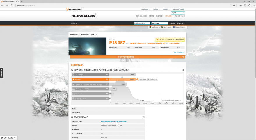 从3DMark 的跑分来看,GT73VR 里的 GTX 1080 在性能上,跟桌面版的 GTX 1080相差无几,这台笔记本要比 Eurocom X8(GTX 980M SLI)快20%,以及要比桌面版的 GTX 980 快70%。