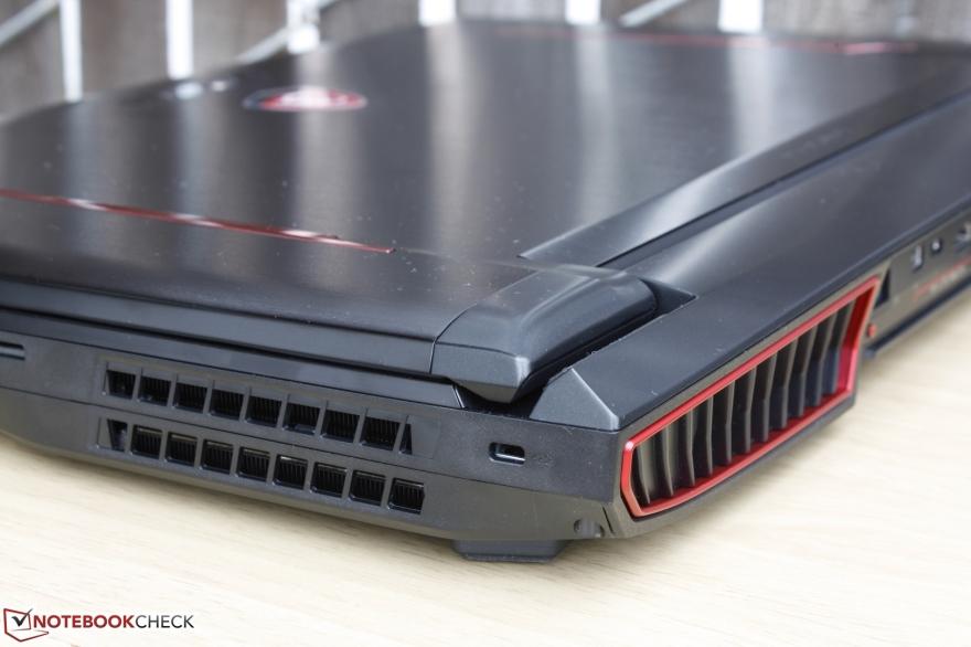 GT73VR 6RF 的机身做工同样非常出色,不同材质拼接的十分自然,不会有缝隙出现,机身背面的散热孔分布在了两侧,不过机身底部算是一个较为脆弱的地方,因为底部采用了大面积的镂空设计,而且主要的元器件都位于此处,万一从高处跌落很容易发生损伤。