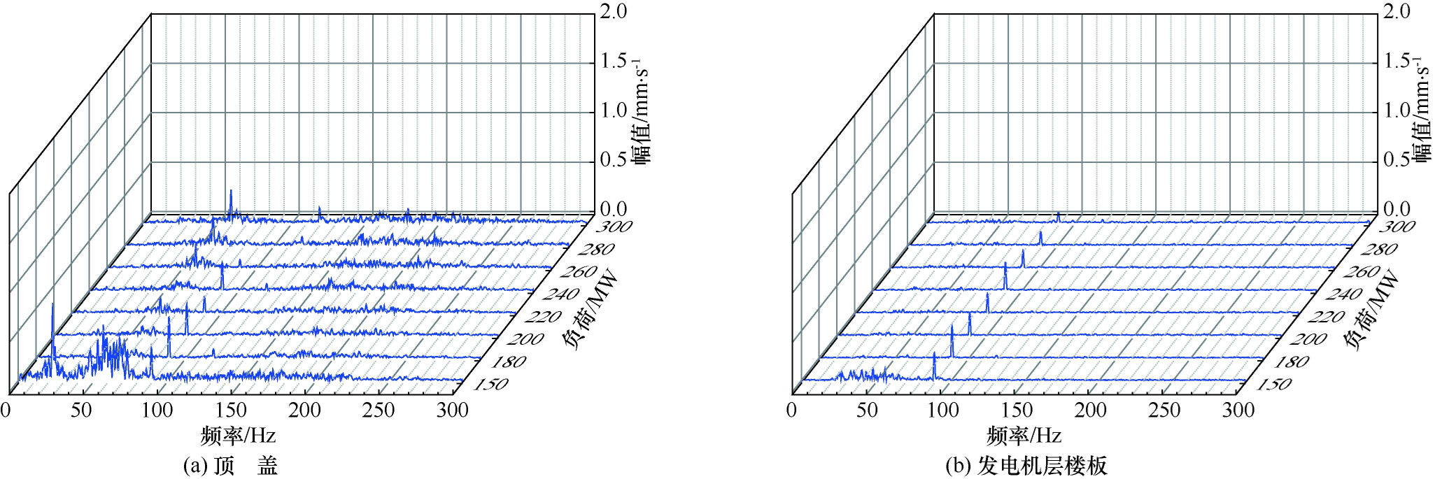 图5 顶盖垂直和发电机层楼板振动频域瀑布图