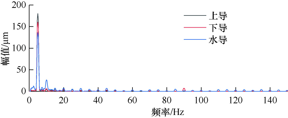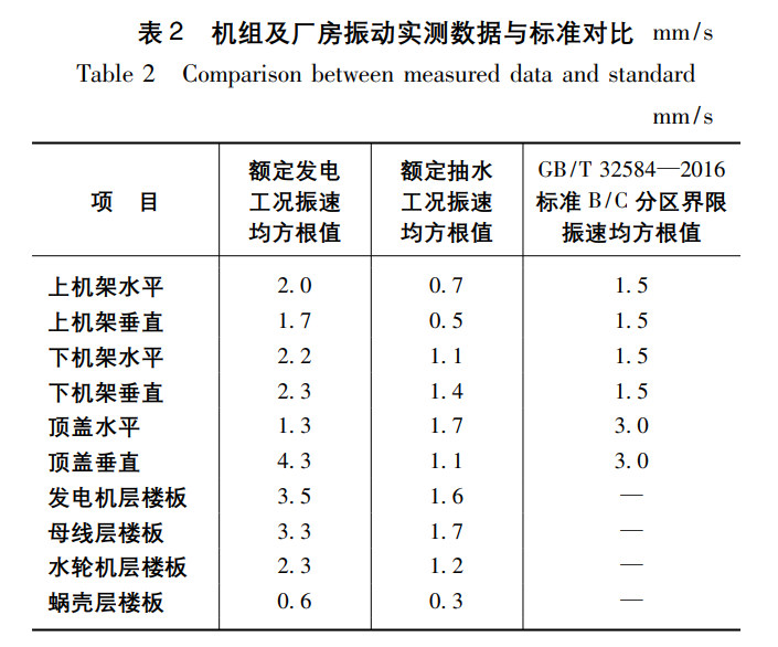 机组及厂房振动实测数据如表2 所列,参考《水力发电厂和蓄能泵站机组机械振动的评定》(GB/T 32584—2016)评价标准,300 MW额定发电工况下,顶盖垂直与上下机架振动均进入C区,该区域长期运行将对机组使用寿命产生负面影响,必须采取措施减小机组振动。