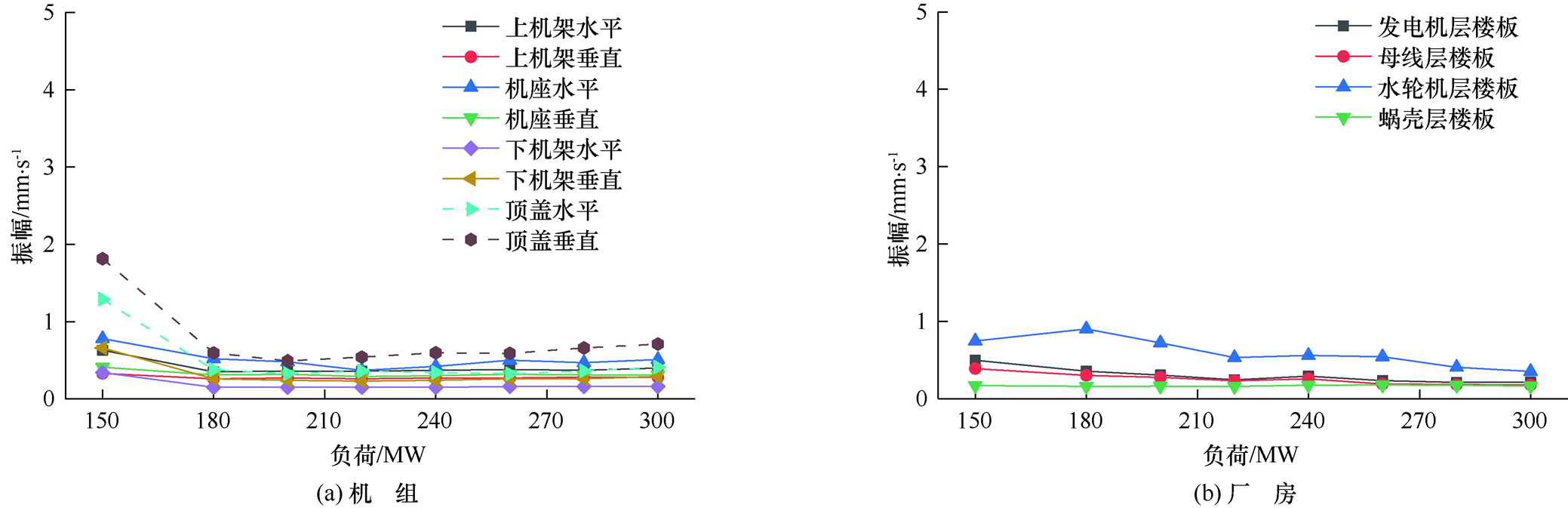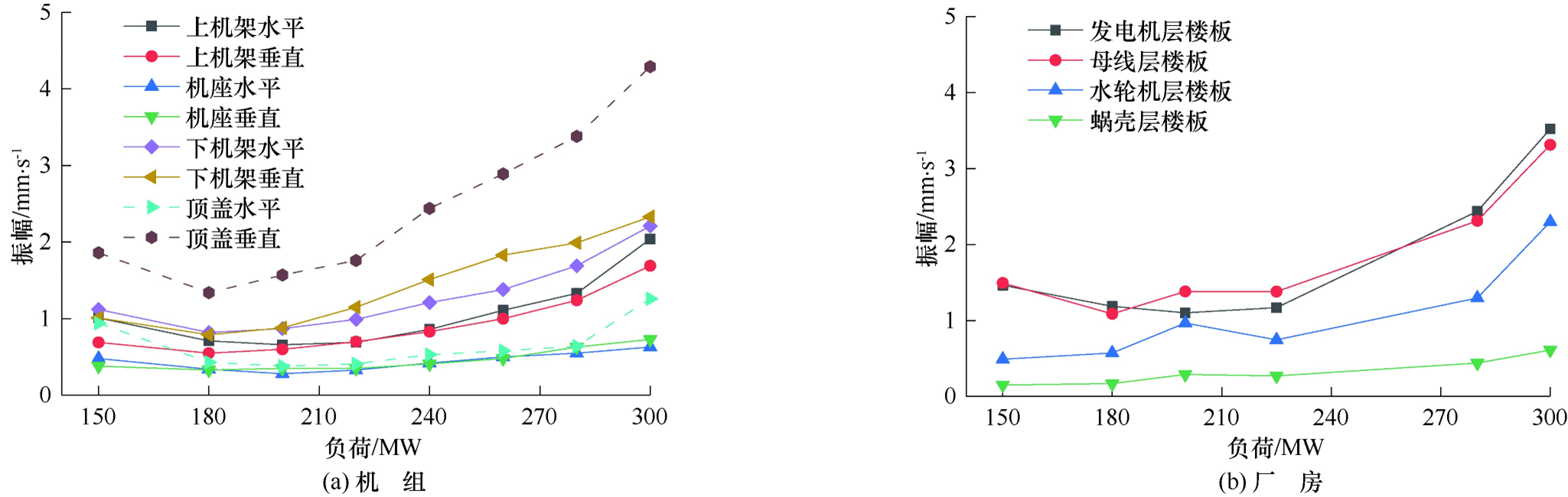 图8 改造后机组和厂房振动幅值与负荷关系曲线