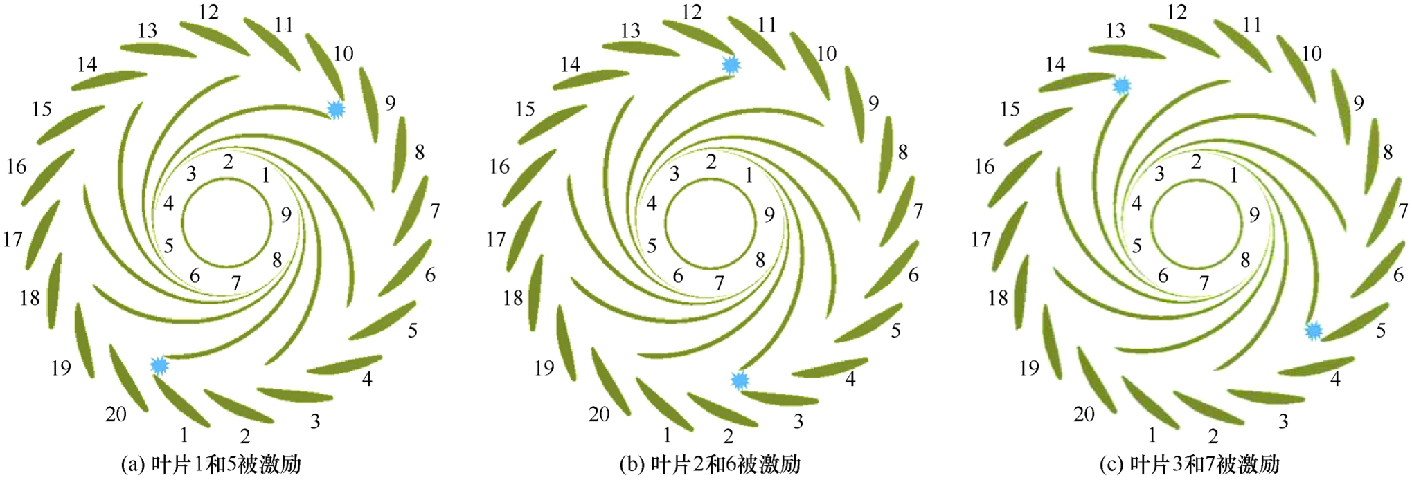 水泵水轮机导叶出水边一般设计较厚,当流体经过导叶后,会形成尾迹效应,尾迹效应是由导叶本身带来的流动损失,以及压力面和吸力面的压力梯度所造成。当运动的转轮叶片经过导叶出口的尾迹时,会造成尾迹切割,同时尾迹对转轮叶片产生冲击,使转轮受到一个规律性和周期性的激励。图1 为转轮叶片数为9、活动导叶数为20的动静干涉示意图。首先是叶片1和5同时被活动导叶1和10产生的尾迹所激励;转轮顺时针旋转4°后,叶片2和6同时被活动导叶3和12产生的尾迹所激励;转轮再顺时针旋转4°后,叶片3和7同时被活动导叶5和14产生的尾迹所激励。由于总是两个叶片被同时激励,因此会产生2节径的压力脉动振型。