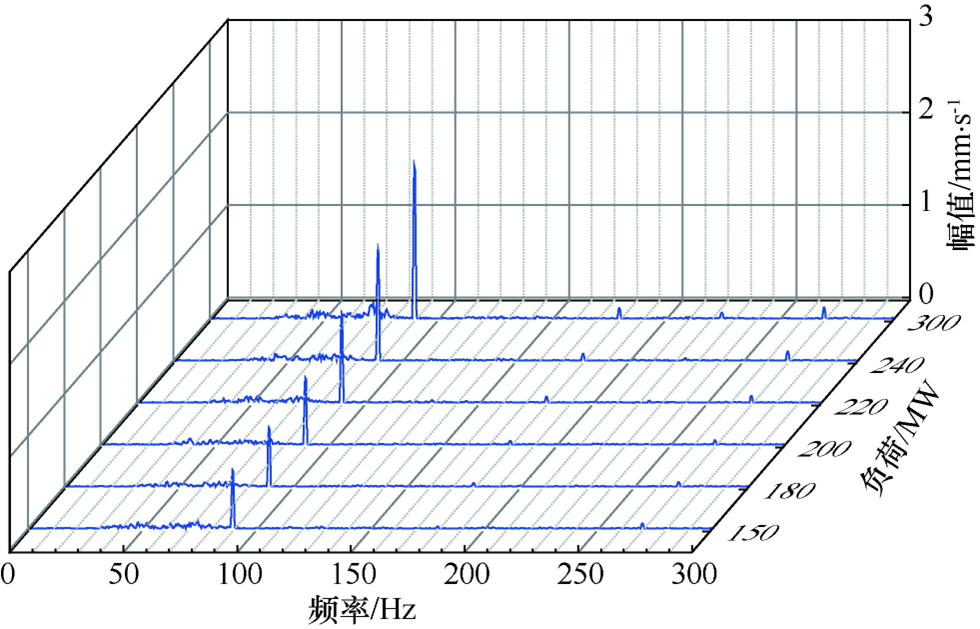 该抽蓄机组蜗壳进口直径D为2 990 mm, 平均直径取0.8D为2 392 mm; 转速N为300 r/min; 根据计算经验,波速a一般为1 000~1 200 m/s, 这里取1 100 m/s; 由动静干涉机理分析可知,9+20叶片组合压力脉动振型表现为2节径,因此k=2。参考前面相位共振风险评估相关分析,由式(5)得到马赫数M=0.034 16。转轮叶片数Zr为9,导叶数Zs为20,式(6)中的符号取“+”,由式(7)计算出Rf=83.6%,远超过25%,发生相位共振的风险很高。由图7中的压力脉动频谱可知,蜗壳进口压力脉动以90 Hz为主;由图11 蜗壳振动测点的频域瀑布图可知,蜗壳进口振动也以90 Hz为主,且随负荷升高而增大;此外,机组高压岔管上方民居可测到主频为90 Hz的振动响应。由以上分析可以判断,动静干涉引起的压力脉动,向上游传播,在蜗壳进口端以及上游高压管道内引发相位共振,这种可能性是存在的,但目前的测试数据不足以支撑相位共振这一推论。