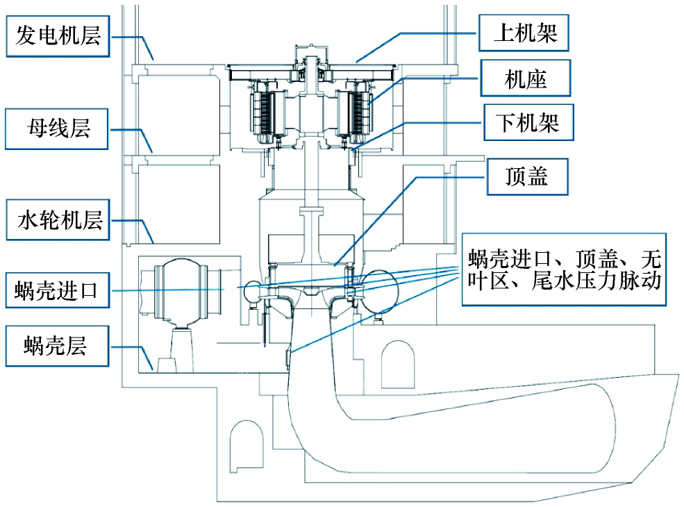 测点主要包含厂房振动、机组振动、压力脉动三个部分(见图3 )。其中厂房振动测点主要包含发电机层、母线层、水轮机层、蜗壳层的楼板垂直振动;机组振动测点主要包含上导、下导、水导摆度,上机架、机座、下机架、顶盖、蜗壳进口振动;压力脉动测点主要包含蜗壳进口、顶盖、无叶区、尾水管。