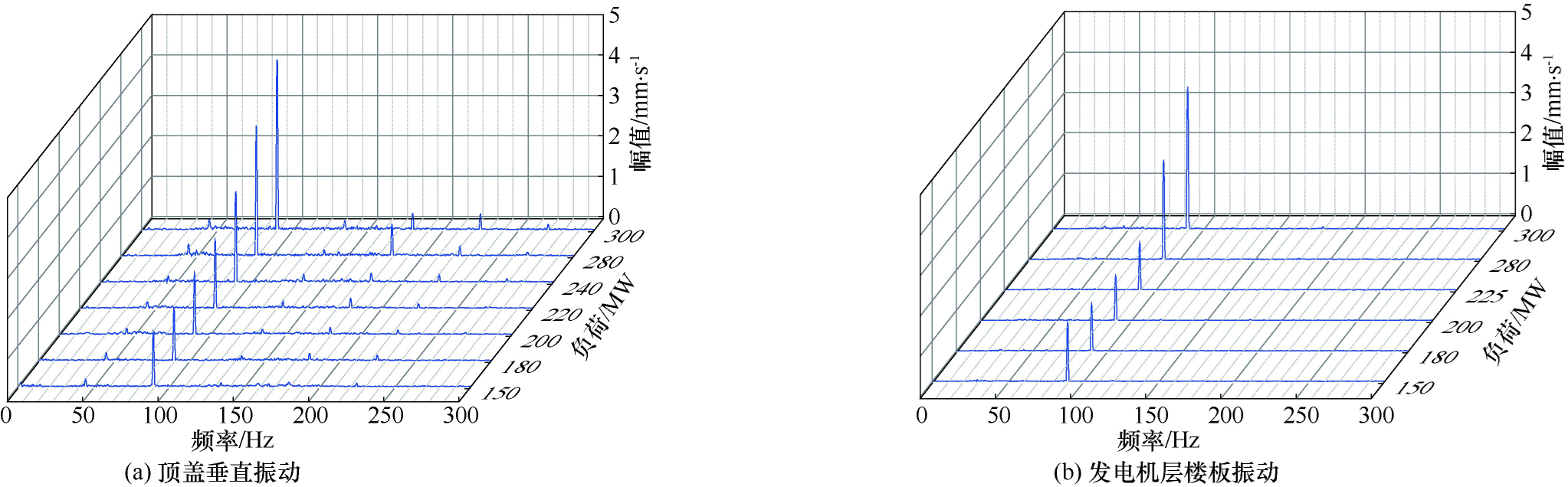 图10 改造后顶盖垂直和发电机层楼板振动频域瀑布图