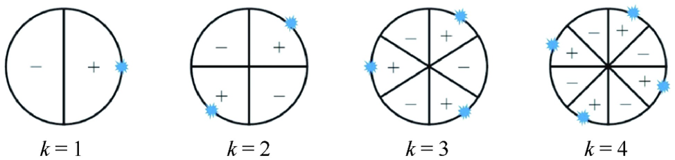 图2 为不同节径数的振型。其中星号表示动静干涉引起的水力激振最高点,+、-表示振动方向相反,在最高点和最低点之间会有位移为0的沿直径分布的一条线,就是节径,并且节径会随着转轮旋转而旋转。