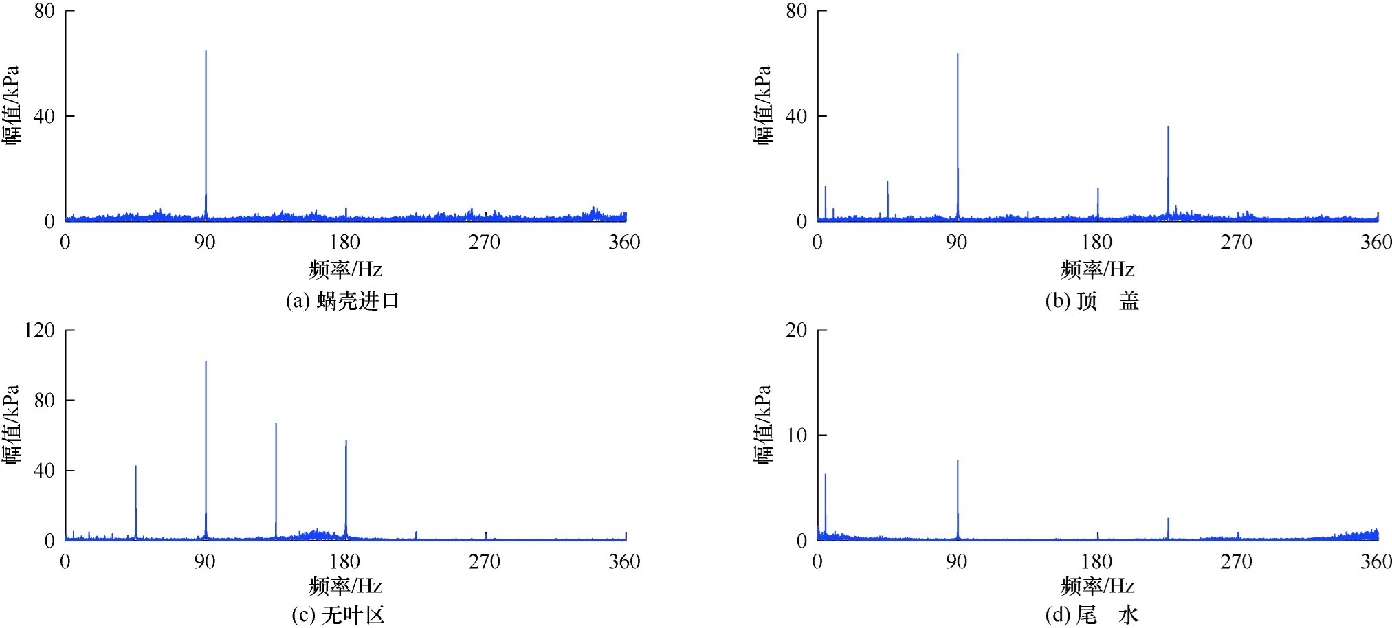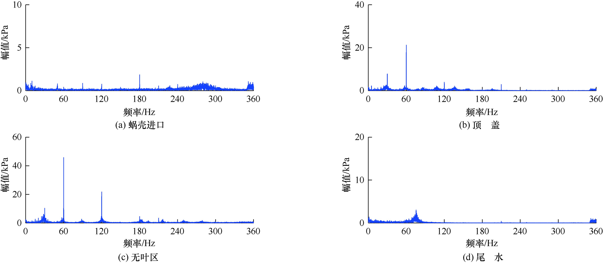 图9 改造后蜗壳进口、顶盖、无叶区、尾水压力脉动频谱