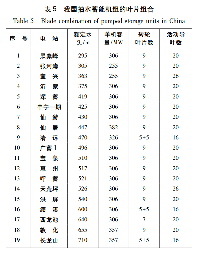 转轮改造通常有两种方式:一种方式是改变转轮叶片数,通常是增加转轮叶片数或者采用长短叶片;另一种是叶片数不变,通过增大导叶分布圆、优化转轮叶片型线等方式来获得更好的水力特性。表5 为我国300~700 m水头段部分抽水蓄能机组的叶片组合,其中大部分采用9+20组合,通过统计分析,国内9+20组合的抽蓄机组,大部分都存在2倍叶片过流频率较为突出的问题。而长短叶片只有5+5的应用案例,且都是配16个活动导叶。由引言部分的介绍可知,长短叶片在减小压力脉动、降低转轮动应力、提高水轮机和水泵效率等多个方面都存在一定的优势。由于活动导叶下端轴安装在底环上,底环属于埋入件,因此活动导叶数无法改变,依然为20。如果采用5+5长短叶片,组合数为10+20,而这个组合由前面的公式可知,k值为0,这种模式下的水力激振容易引发轴向振动,使机组产生较大的振动和噪声。综合分析各种叶片数的优缺点,并结合CFD分析和模型试验研究,本案例最终采用6+6长短叶片转轮,这也是世界首台6+6长短叶片水泵水轮机应用案例。
