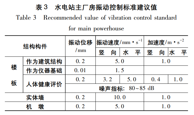厂房振动方面,国内水电站相关规范如《水电站厂房设计规范》(NB/T 35011—2016)仅对机墩的振动控制有要求,而对楼板振动没有明确要求,大连理工大学综合分析国内外相关规范,针对国内水电站厂房提出的建议振动标准如表3 所列,300 MW额定发电工况下,发电机层和母线层楼板的振动最大值超过标准中的3.2 mm/s, 从人体健康角度评价,运维人员不宜长时间在此环境中工作,应该采取措施减小厂房振动。