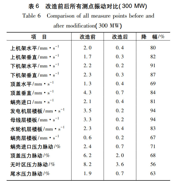 如表6 所列,更换转轮后,300 MW额定发电工况下,机组与厂房振动大幅减小,机组振动和厂房振动降幅均超过60%,其中机架和顶盖垂直振动降幅超过80%,发电机层和母线层楼板振动降幅甚至超过90%,且转轮改造后机组和厂房振动随负荷升高明显增大的现象彻底消失(见图8 )。压力脉动相对值也大幅减小,无叶区、顶盖、蜗壳进口、尾水降幅均超过50%(见表6)。由于叶片数的改变,压力脉动频谱中的第一主频由18fn变为12fn,即90 Hz变为60 Hz(见图9 ),90 Hz分量很小,此时的90 Hz来源于1.5倍叶片过流频率,这是长短叶片转轮压力脉动频率特点。