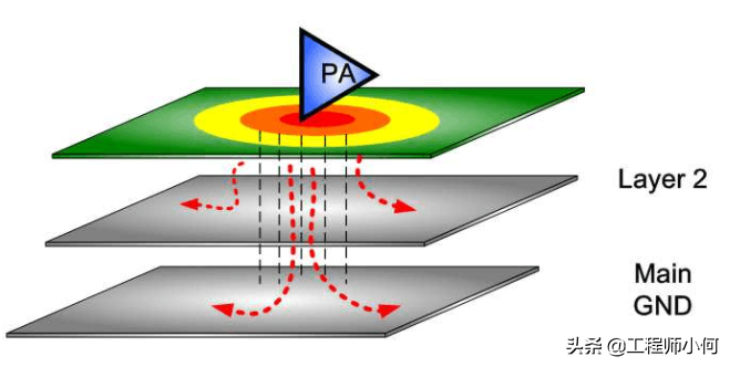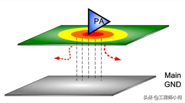 但下层不铺地, 那么热就不易透过GND Via传导过去(因为距离长 电阻大)。 此时散热效果就大打折扣,最糟情况是热都传不过去Main GND,全都积在PA下方。