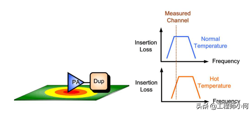 第五是倘若双工器又离PA特近,那主频功率会大幅衰减[5]。因为Duplexer的频率响应,是会随温度而有所变动,如果离PA过近,散热又不好,一旦高温使其频率响应有所偏移,那么很可能主频的功率,会大幅衰减。