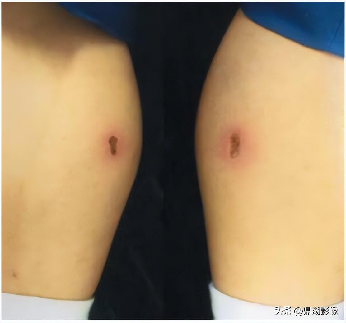 直接皮肤接触引起的热损伤相对少见,临床特征是伤口相对较小,对称性分布。再来看2个下肢皮肤热损伤的例子。