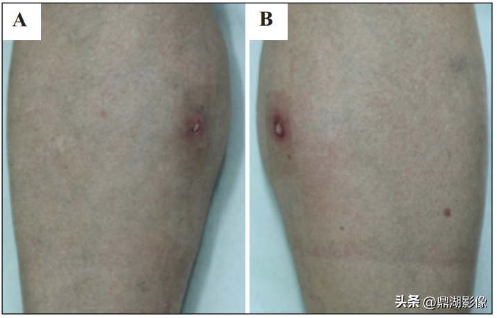 图3: 第一次就诊后一周,在右(A)和左(B)小腿内侧发现皮肤深部烧伤溃疡,呈对称分布。