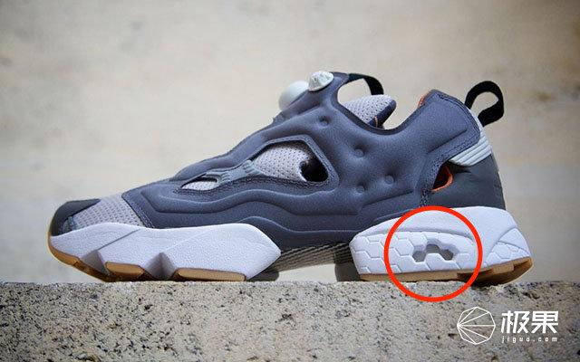 Pump Fury 的后跟上有一个小孔,从那个小孔里看进去,能看见蜂巢一样的六边形结构,那就是 Hexalite 缓震气垫。