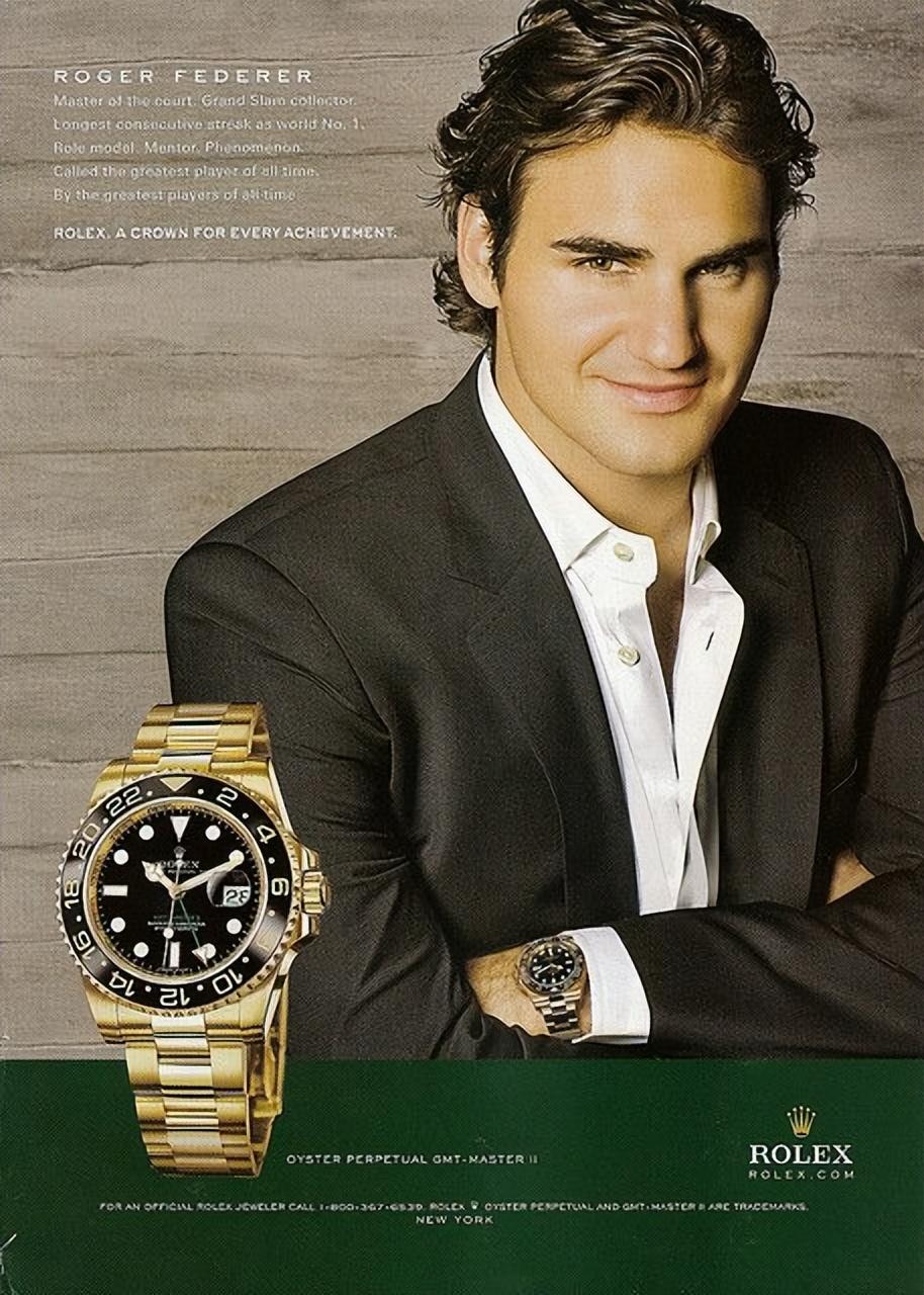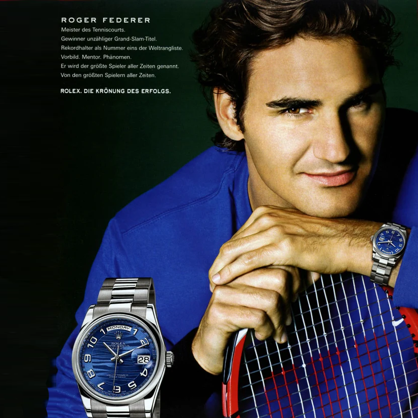 Rolex是另外一个跟Federer连在一起的符号,当争夺冠军的比赛结束,Federer都会走到场边,从球包里拿出一支劳力士。
