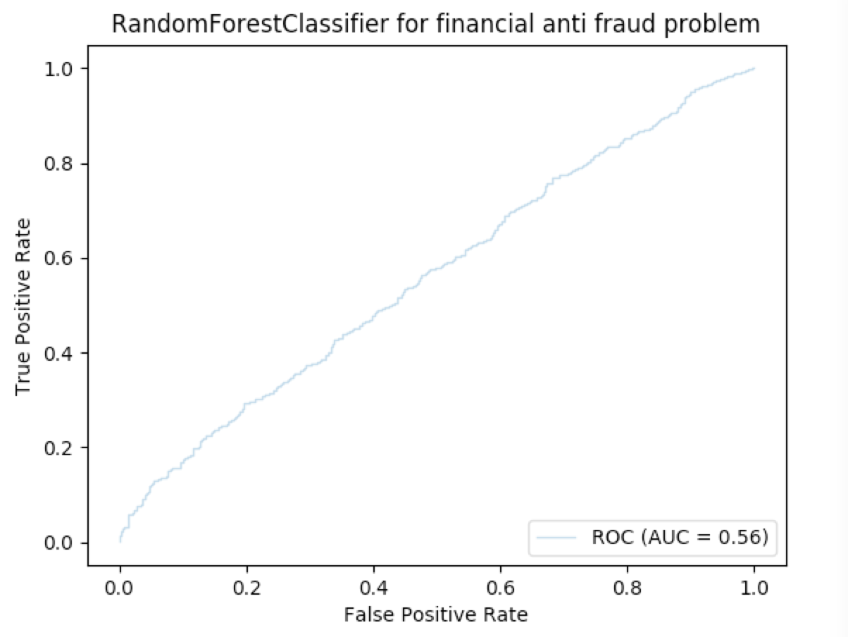 大家是否还记得之前介绍NB的时候给出的一个实际的互联网金融反欺诈case,最高的高斯模型可以达到0.56,但是换成伯努利就差的多了,如果不做LR变换可能就更差了。下图是基本没有调参情况下得到的RF,AUC=0.56,小白还尝试了调试几次参数,发现效果都不明显,意味着当前能力下,RF可以迅速的收敛。