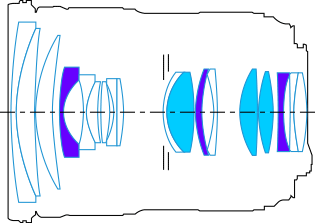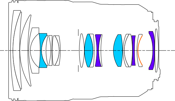 先来说说与EF版在光学设计上的变化吧,一般来说光学系统设计求解主要有2个思路,第一是借由同类型的成型设计进行缩放优化,缺点是设计指标的适应性差,但优点是容易上手,比如RF与EF版24-70mm F2.8光圈前的部分就相当形似(事实上很多此规格镜头都是这类前组),都是3片正组+6片负组的组合,乍一看面型倾向性差不多,区别在于在光束由收敛向发散转向的位置,RF选择了UD而EF选择了非球面,各有优点,其实如果能用上RF 70-200mm里的那种非球面UD复合设计就两全其美了……总体用料上两者差别不大,EF版多了一个超级UD(可近似理解为人造萤石),以及其中一片非球面为研磨抛光工艺,但RF版有光学防抖和ASC镀膜。