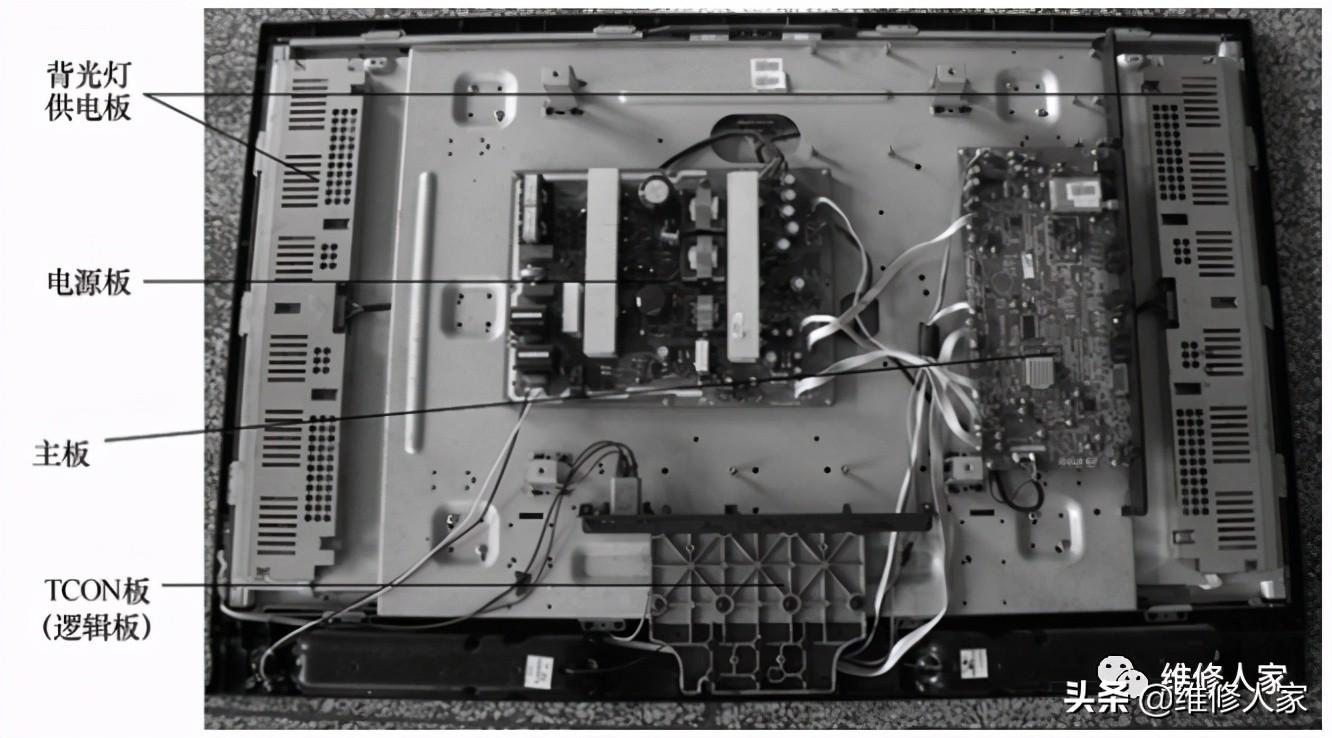 背光灯供电板上安装了高压逆变器(背光灯是 CCFL 灯管)或是直流电源(背光灯是 LED灯条)。时序逻辑板(在屏蔽罩下面)也叫液晶屏时序信号控制板或定时板,它上面安装了时序信号处理电路、驱动电路。