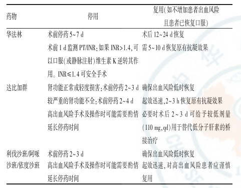 高危患者,术后12h出血停止后使用抗凝药;中危患者,术后12~24h出血停止后使用抗凝药;低危患者,可仅使用基本预防措施和物理方法预防。若患者存在高出血风险,抗凝药可以延迟至术后24 h使用或不使用药物抗凝。(4) 一般抗凝血药物应用10~14d,个别患者术后静脉血栓拴塞风险仍高可延长至15~35d 。当患者出现凝血功能异常或出血事件时,应综合评价出血与血栓的风险,及时调整药物剂量或停用。