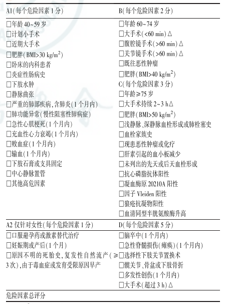 注:①每个危险因素的权重取决于引起血栓事件的可能性。如癌症的评分是3分,卧床的评分是1分,前者比后者更易引起血栓;②△为只能选择1个手术因素;③危险分级:低危为0-1分;中危为2分;高危为3~4分;极高危为≥5分。