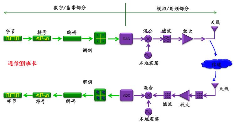 下面是一个典型的通信系统的例子。更具体地说,它是一种典型的无线通信结构。绿色的部分在无线和有线通信中都会看到,而紫色的部分可以在无线通信中看到。数字通信教科书或信号处理书籍中看到的是与绿色相关的部分。你在RF教材中看到的是紫色部分。在这里,班长不会详细地评论这些组件中的每一个。把这个插图放在这里的目的,只是给你一个完整的通信系统框架。