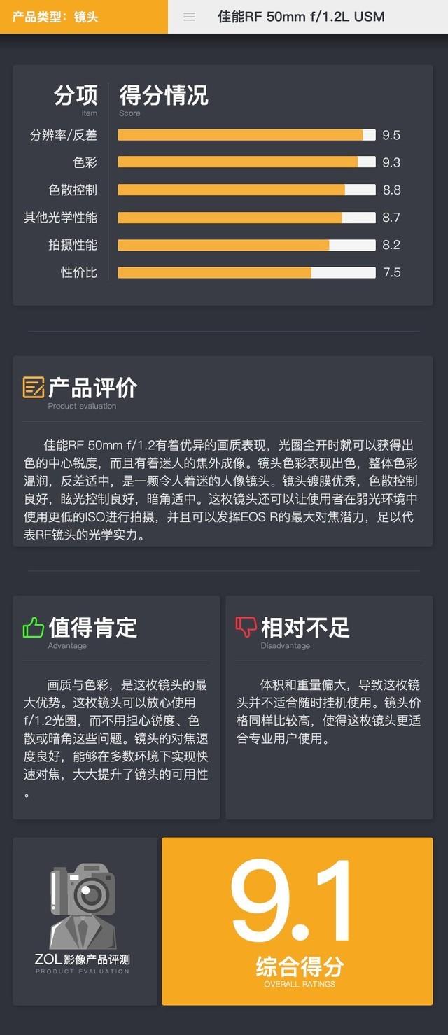 佳能RF 50mmf/1.2综合得分