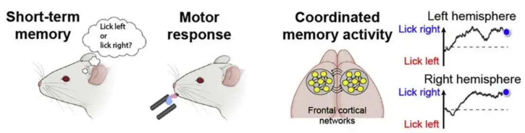 ▲小鼠执行短期记忆的任务时,左右两侧大脑的前额皮质出现了高度一致的持续神经活动(图片来源:参考资料[1])