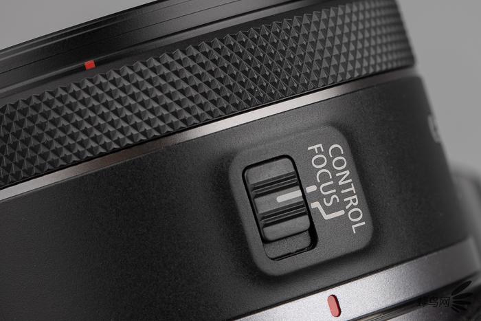 佳能RF50mm F1.8 STM的镜头前方最值得一提的就是对焦/多功能控制环,这是外观上区别于佳能EF镜头的一个部分,滚花的设计在转动控制环时带来很好的摩擦力,同时控制环功能可自定义,可将光圈、快门速度、ISO感光度或曝光补偿,任一个功能分配到镜头的控制环上,大大提升了操作便捷性。而整个镜筒只有一个对焦/控制环的切换开关。