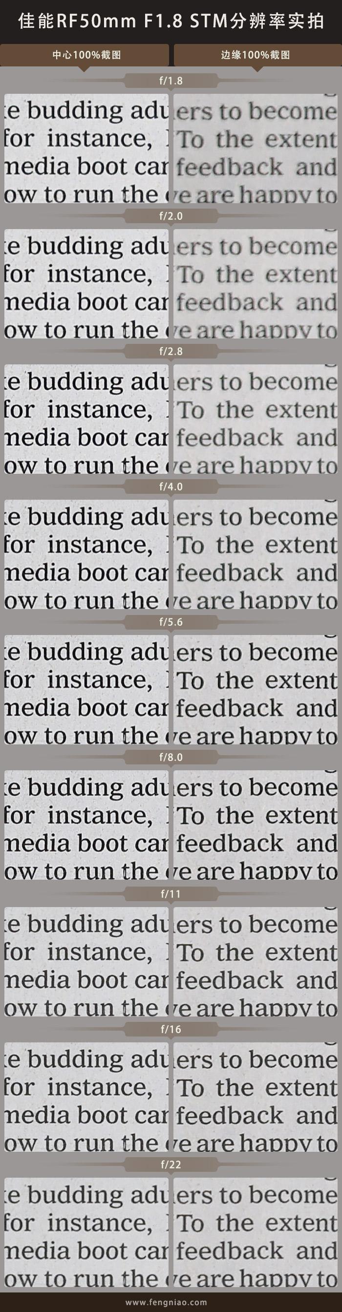 对于这样一支以“标头”为标签的镜头,相信各位一定很关心它的实拍画质表现。实拍测试环节,使用佳能专微EOS R5作为测试机身,采用光圈优先并将ISO设定到100,测试过程中关闭机身防抖,使用三脚架延时10秒,并对各挡光圈逐一拍摄,最终截取画面中央与边缘的部位进行100%放大对比,下面我们实际来看看佳能RF50mm F1.8 STM的中心和边缘画质表现。