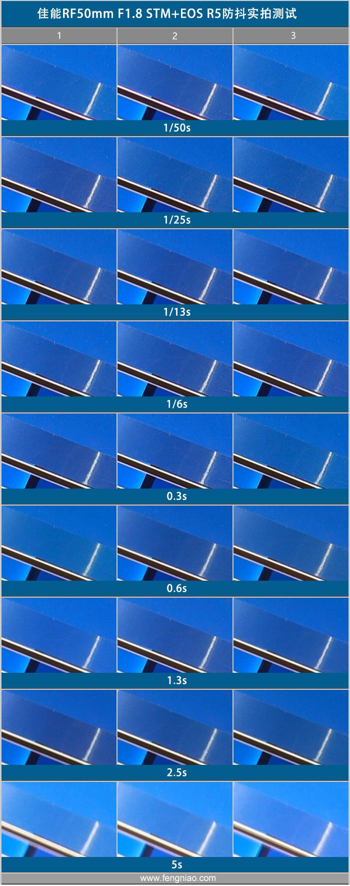 在手持测试防抖效果时,我采用站立姿势进行拍摄,其中每挡快门速度单张拍摄,并且只拍摄3张。因为手持稳定性因人而异,防抖效果的展示大家作为参照即可。按照我们的标准,3张照片中有2张拍摄清晰即为防抖功能有效,根据实际的拍摄情况,我觉得可以用挑战极限来形容,因为佳能RF50mm F1.8 STM搭配EOS R5之后,完全依托机身防抖功能,甚至在手持5秒的时候也能拍摄一张清晰的照片,的确非常的强悍。