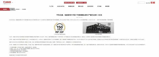 2021年2月4日,佳能宣布截止到2021年1月累计生产了1.5亿支用于EOS相机的RF和EF系列可换镜镜头,这实现了镜头制造领域的一项新的里程碑。