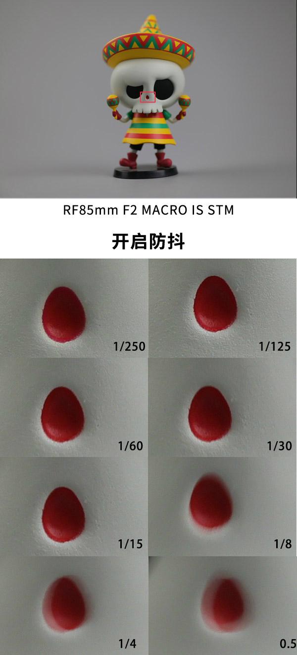 无论是在无法保持稳定持机或不能使用三脚架的场合,还是在拍摄静物、夜景等想要将ISO感光度调低获得噪点更少的高画质图像的场合,防抖都很大程度上决定着我们的成片率,RF85mm F2的镜头光学防抖具有5级的手抖动补偿效果,接下来就让我们来看一看这只镜头的防抖表现,我们选择快门优先曝光模式,开启镜头防抖,从1/250s开始整档下降手持拍摄,截取画面的放大切片如下: