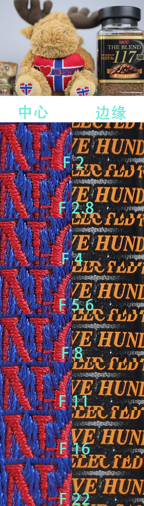 为保证样片尽量客观,我们关闭各项优化,拍摄时将相机固定在三脚架上,机内白平衡设置为自动进行光圈逐级拍摄,截取中心和边缘红框所示位置的100%放大切片,结果如下: