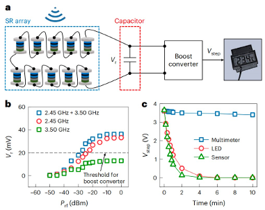 自旋整流器阵列可以被集成到射频能量收集模块中,用于宽带整流和为电子设备供电。自旋整流器阵列的信噪比(SNR)和噪声等效功率(NEP)性能适用于嘈杂环境中的低微波功率检测器应用;此外,自旋整流器阵列可以在-27 dBm的射频功率下无线为传感器供电,在关闭无线源后,自旋整流器阵列可以使1.2 V的温度传感器和1.6 V的发光二极管(LED)分别保持约50秒和30秒的开启状态,展现出在不连续的射频环境中良好的应用前景。