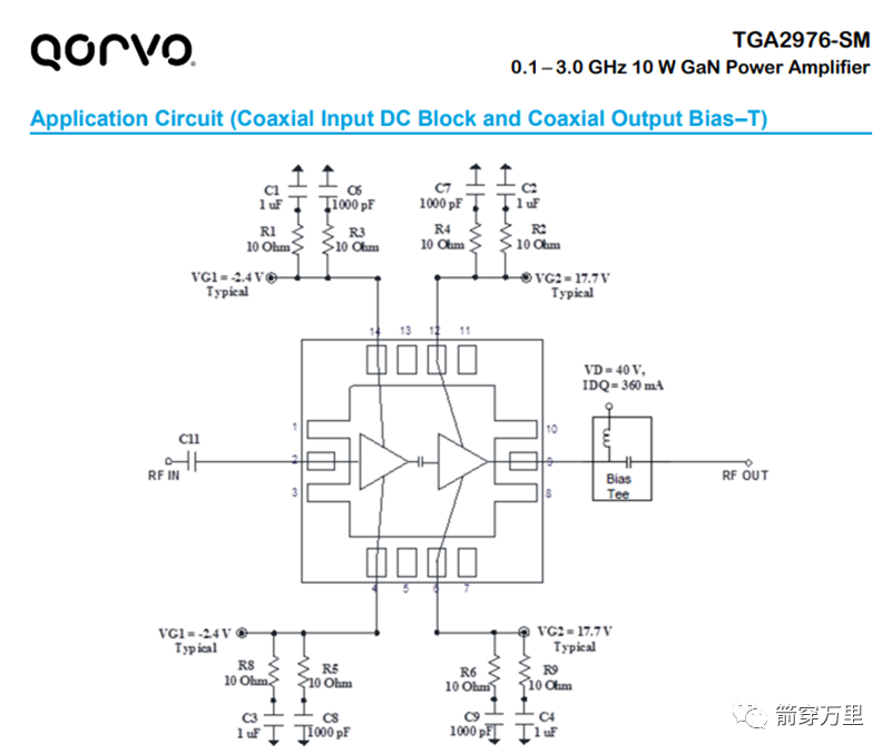 如上图所示需要偏置器的放大器电路示意图。图中,在放大器的输出端添加了Bias-T,用于输出端馈电。