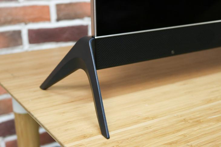 其他的外观设计中我们可以看到OLED电视高端定位所对应的高质感,创维55S9-I电视采用全金属边框加背板的设计,抛光金属边框如镜面一般闪亮,但它却非常平滑。银色金属侧边向下延伸至倒置的V型底座,底座采用了通用的金属材质和处理工艺,两个纤细但却坚固的底座看着颇具力量。