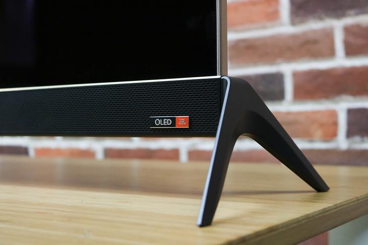 由金属材质打造的底座经过磨砂等工艺处理后非常有质感,另外它还配备了JBL原装音响,而且音响采用了前置设计,减少声音传达到人耳的损失,好声音不浪费。OLED的标识是对这台电视所拥有的前沿显示技术的注释,低调而不简单。