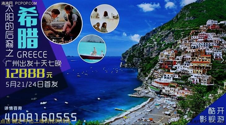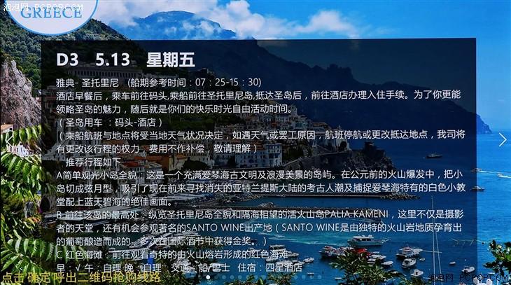 最后我们再来介绍下创维55S9-I电视内特色的Geek Trip版块吧,这是一个旅游项目,想不到如今通过客厅电视都能够下单跟团游了。从界面看到,创维酷开旅行为用户准备了丰富的城市和主题游,例如可以走一场火热影视剧《太阳的后裔》路线,广州出发希腊十天七晚,界面内提供了详细的每日出行路线以及旅行须知,与我们见到的PC或手机端团体游一样专业。如果想要下单,一样手机扫码填入信息即可,没有交互难度。