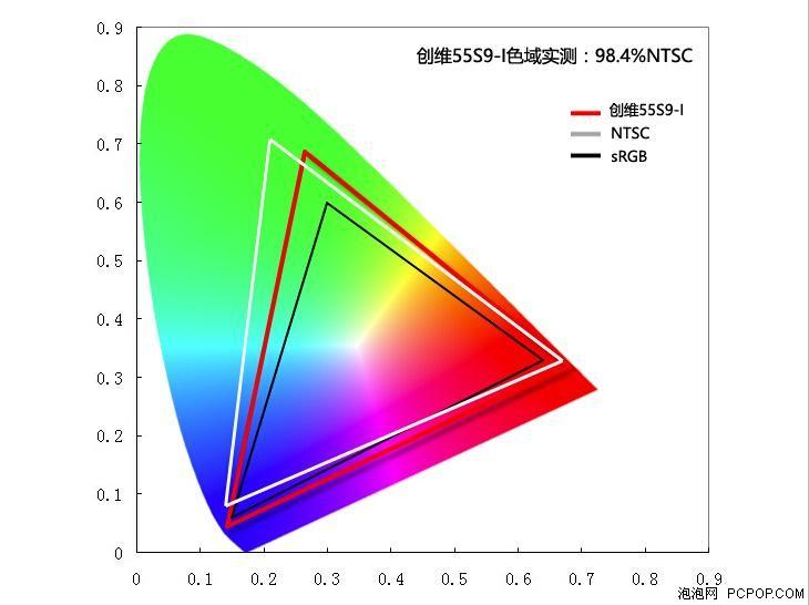 色彩方面,我们通过专业仪器对它的色域进行测试。色域代表一台电视能够呈现的色彩范围区间,人眼移动能区分一千万种颜色,所以电视就要尽可能多的去呈现这些色彩。从最终的测试结果来看,创维55S8的NTSC色域接近100%,明显高于主流电视72%的色域范围。