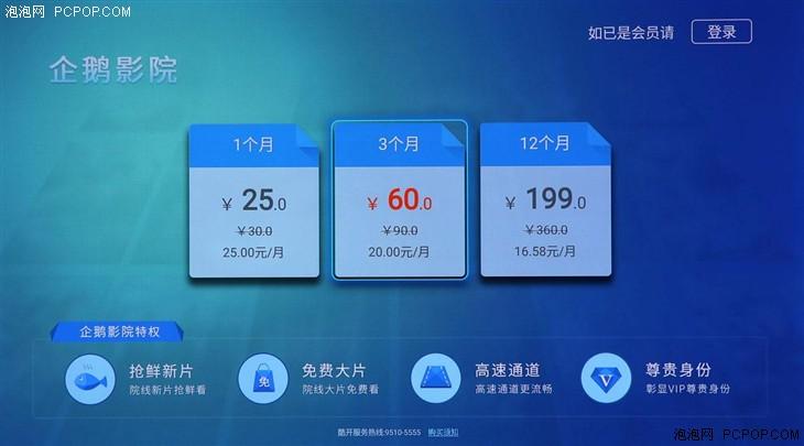 根据我们的体验来看,创维55S9-I的云视听企鹅会员费为199元每年,也可以通过60元每季度或者25元包月的方式购买,价格属于互联网视频平台的中低消费定位,比某些动辄490元每年的会员要亲民的多。