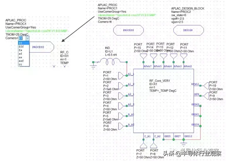 新的库元素可通过标准“拖放”放置到Microwave Office电路设计软件原理图中,就像任何其他原理图元素一样。如图5中的原理图所示,PROCESS块用于引用代工厂PDK制程,并允许用户更改process corners。使用DESIGN块,用户可以访问Cadence设计中的任何设计变量。